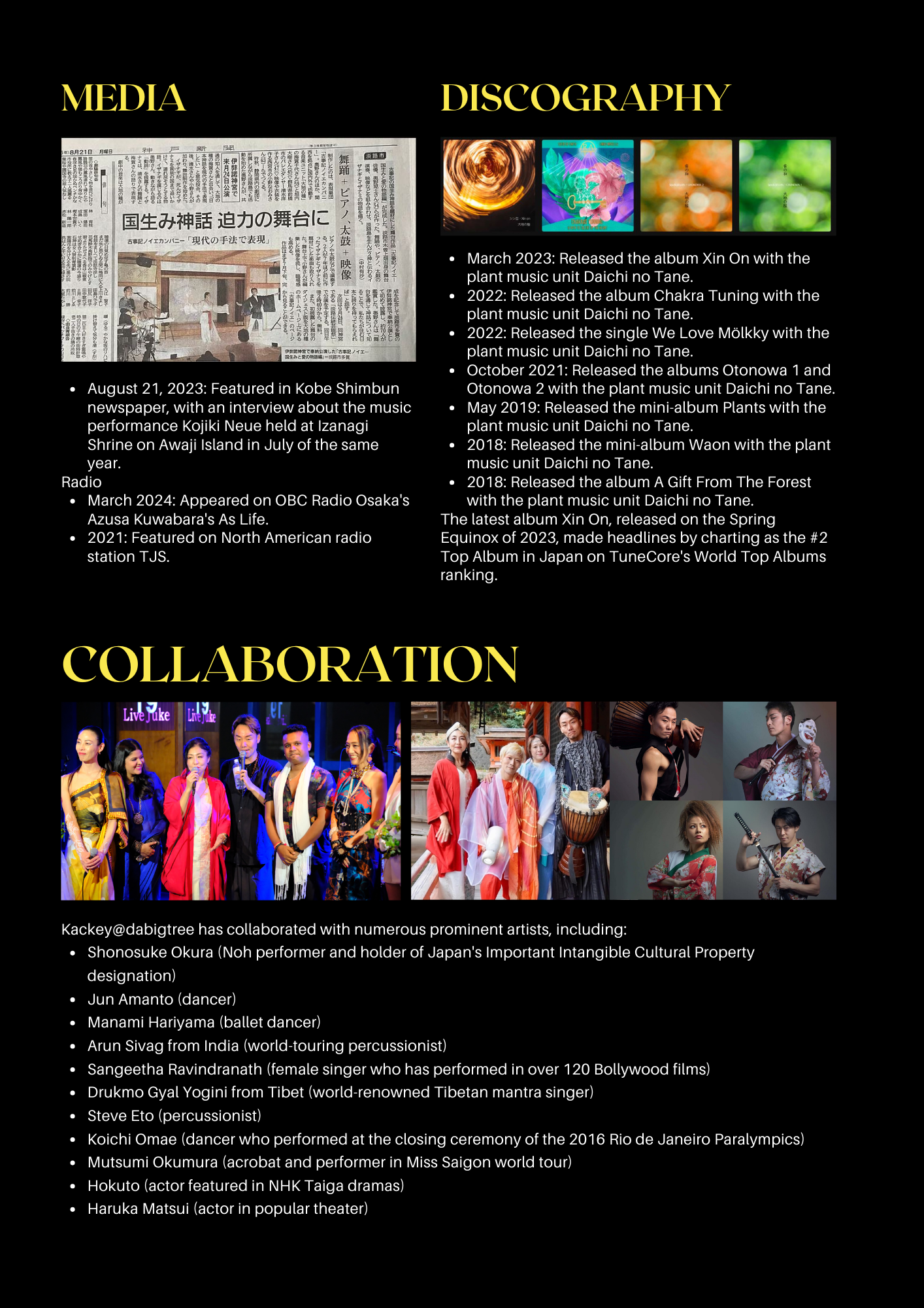 From intimate retreats in Japan’s sacred landscapes to dynamic stages across the globe, Kackey@dabigtree invites you to be part of an unforgettable musical experience. Together, let’s explore the beauty of human connection and the universal language of music.