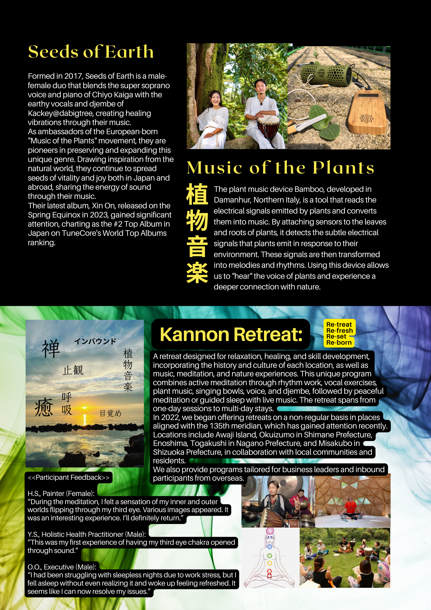 As an official artist of Music of the Plants in Northern Italy, he performs and creates music using plant music using the Bamboo, a device that converts the bioelectric potential of plants into synthesizer sounds, and is said to have one of the highest synchronization rates with plant music in the world.