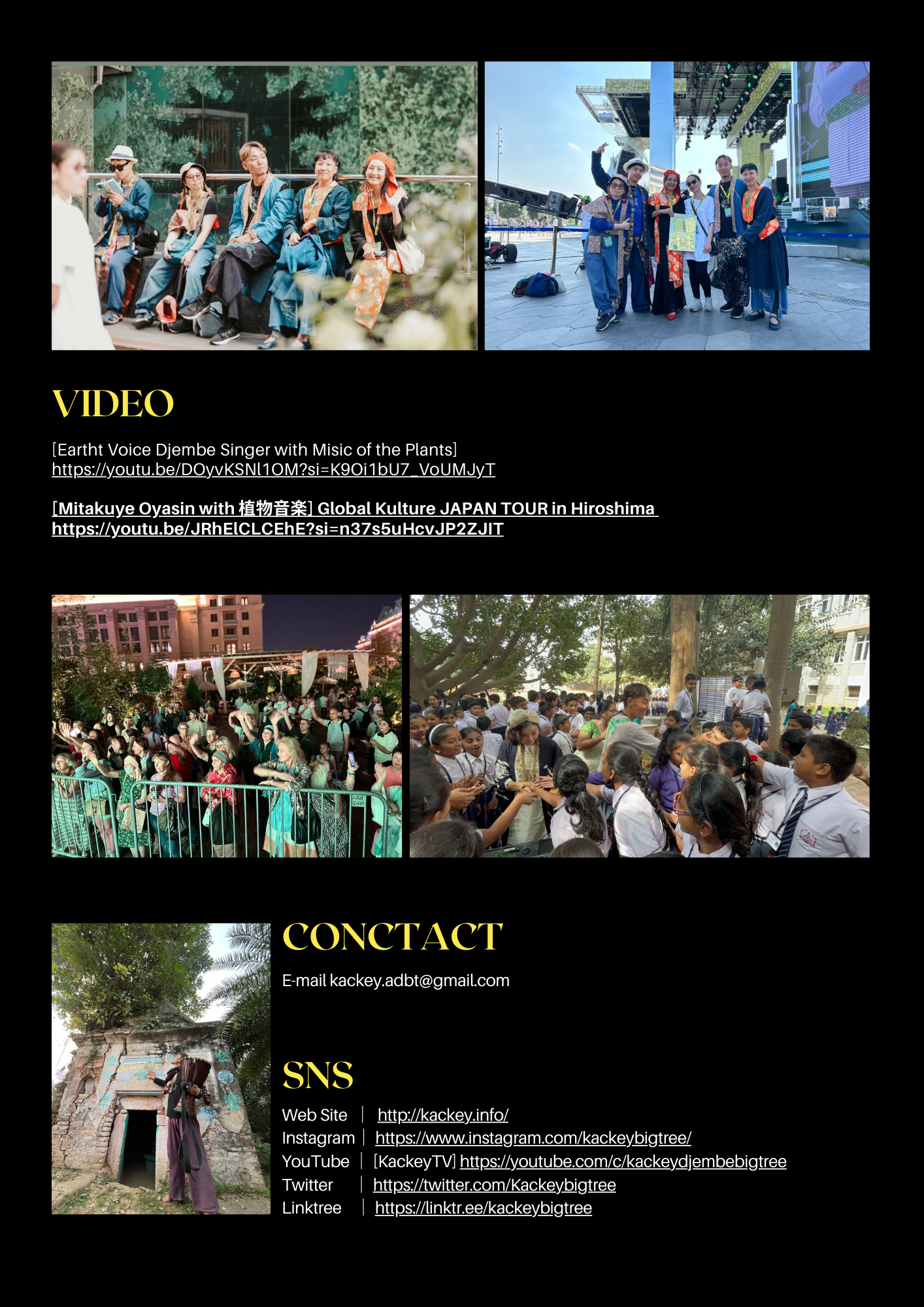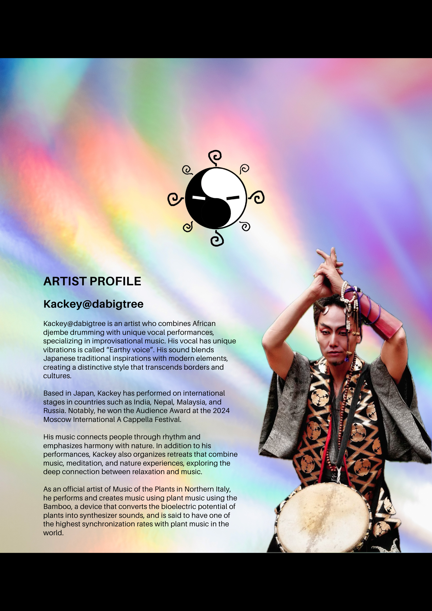 Kackey@dabigtree is an artist who combines African djembe drumming with unique vocal performances, specializing in improvisational music. His vocal has unique vibrations is called “Earthy voice”. His sound blends Japanese traditional inspirations with modern elements, creating a distinctive style that transcends borders and cultures.