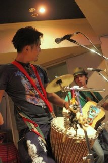 大阪京橋にて沖縄三線、ギター、サックスを弾く人たちに囲まれて西アフリカの太鼓を叩きながら歌う、、。