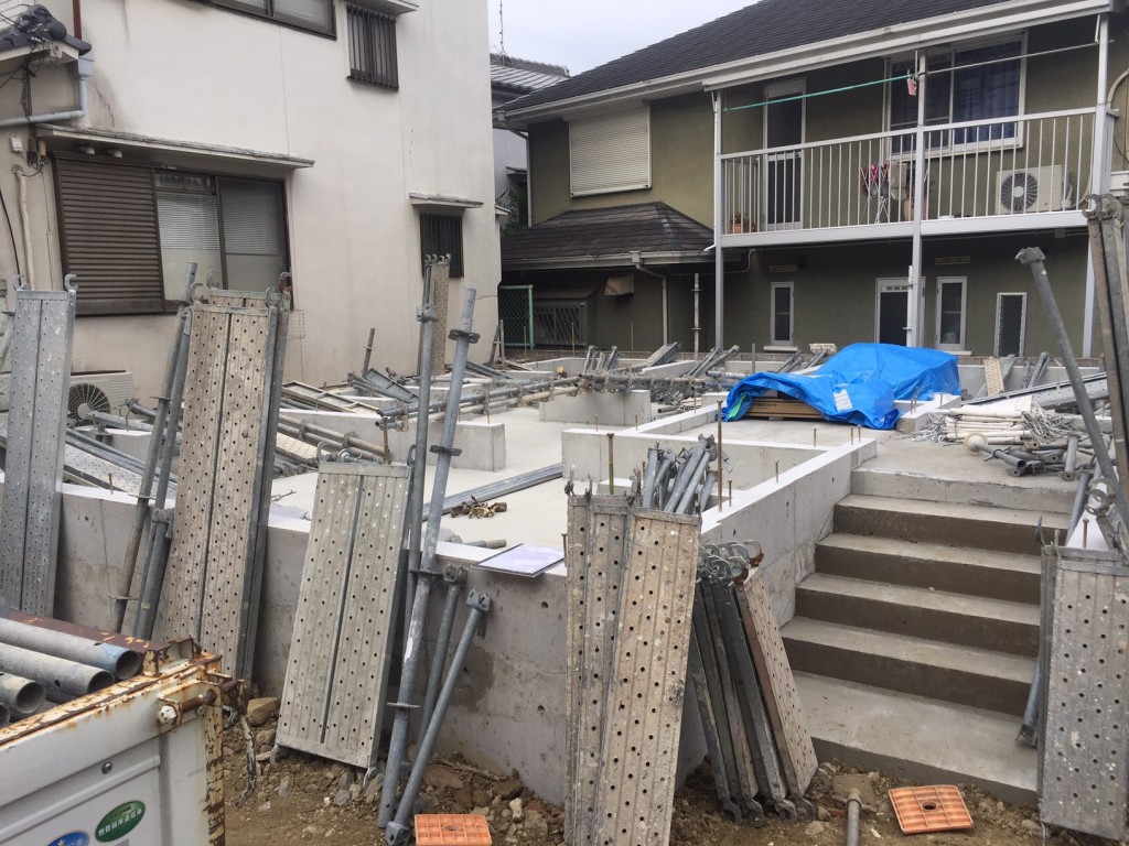 建築予定地へ行くと基礎屋さんが足場を組んでました。