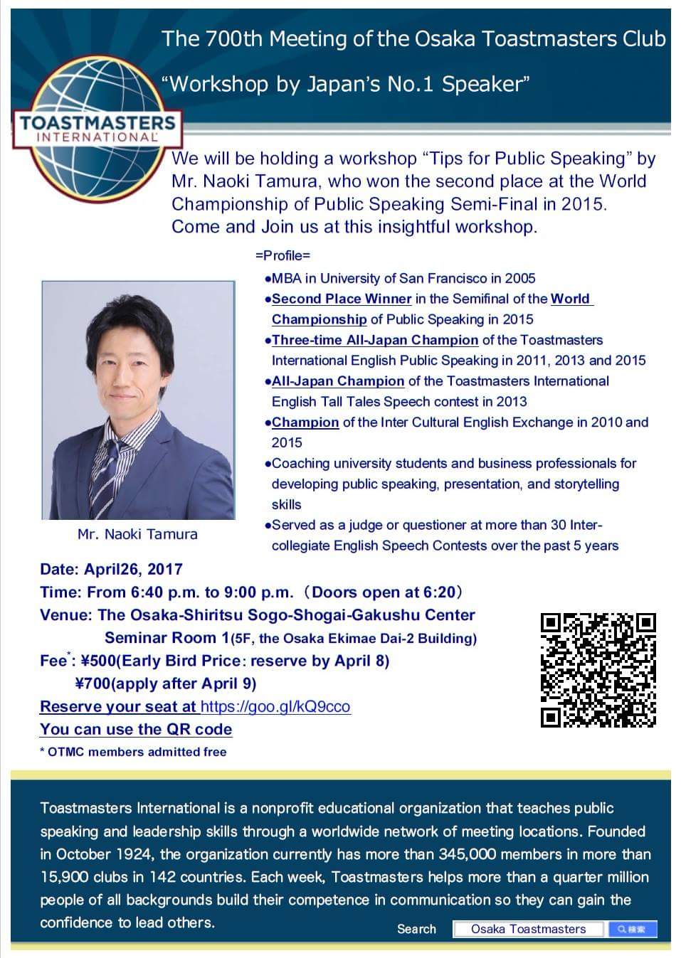 700回を記念して招いたスピーキング世界大会で日本人第一位の田村直樹さんによるワークショップがあるからだ。