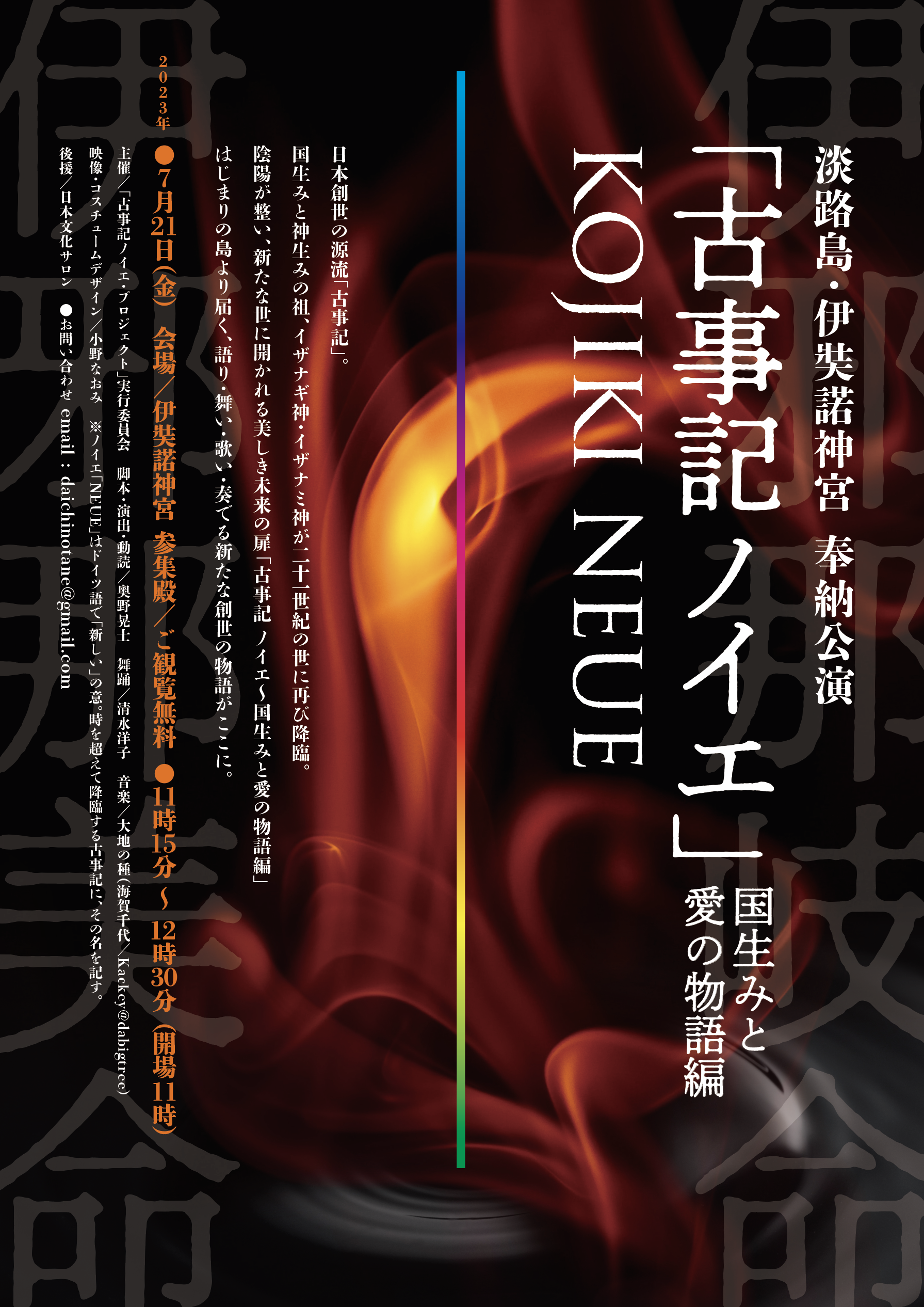 The first performance of “Kojiki Noie,” an original musical performance based on the Japanese myth Kojiki, will be held at Izanagi Shrine on Awaji Island on July 21, 2023.