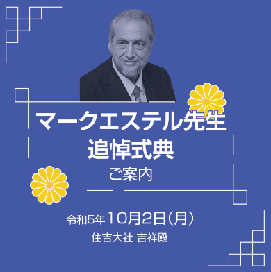 マークエステルさんが大阪にて生涯を閉じられて早4ヶ月が過ぎ、この度、摂津一之宮・住吉大社にてマークエステルさんの遺徳を偲び、また、遺志を後世に伝えるべく、下記の要綱にて「追悼式典」を開催する運びとなりました。