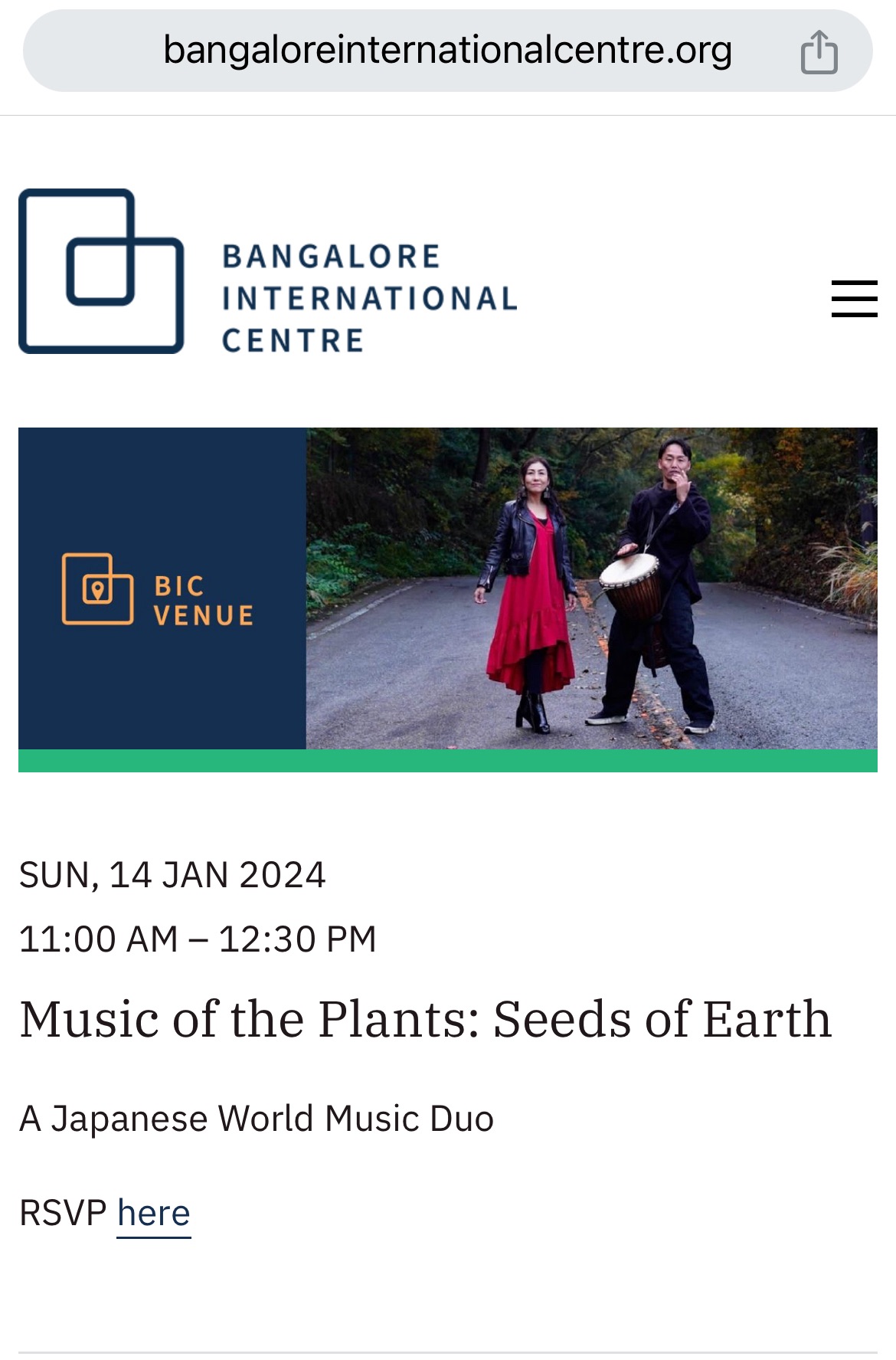 2024年1月14日(日) 11:00〜|権威ある南インド・バンガロール国際センターで植物音楽ユニット・大地の種コンサートを開いていただけることに感謝します。