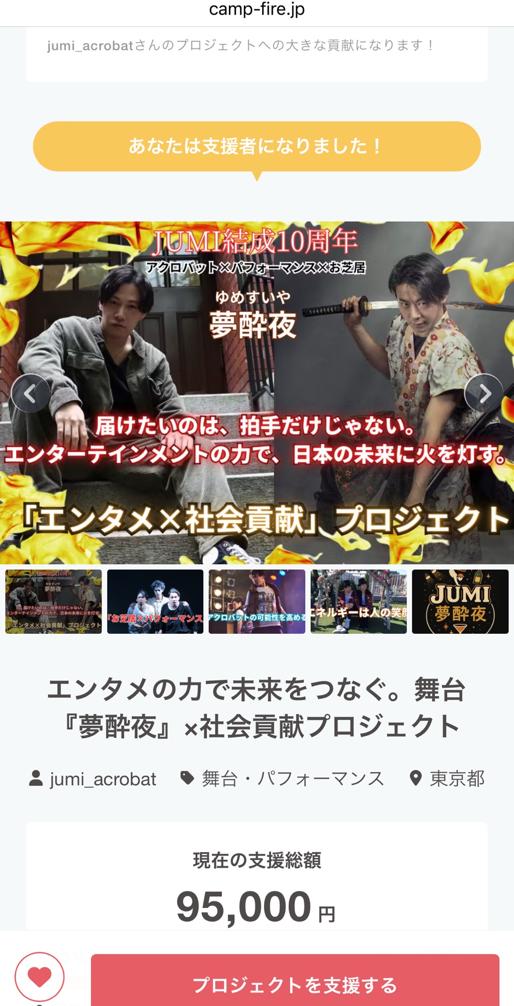 殺陣×アクロバット×音楽を融合させた演楽表現集団 飛花〜Hibana〜のチームメイトである アクロバットパフォーマーで演出家の奥村睦巳とYohjuによるユニットJUMIによるクラウドファンディングがスタート